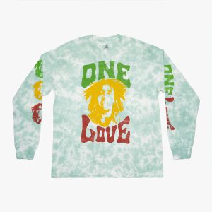 Bob Marley Adult Fit Long Sleeve One Love Tee Green Feel the music when you wear this long sleeve tee that will have you in the clouds from the vibes of his greatest hits. Finished with a cloud wash, it gives the appearance of dreamy patches on the garment surface similar to clouds in the…