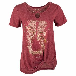Women’s Foil Guitar Silhouette Side Knot Tee Just in time for warmer weather comes are newest top for women. A guitar silhouette is surrounded by floral gold foil treatments while soft burgundy fabric, cross front neck design and side knot add comfortable stylish touches.