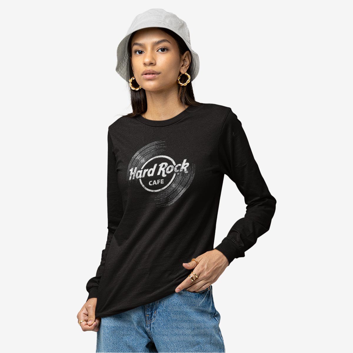 Adult Fit Vinyl Logo Longsleeve in Black Spin right round in our Unisex Fit Hard Rock vinyl logo longsleeve tee. Soft blended fabric, just the right amount of stretch, and a casual fit for every day of the week. Pair it with skinny jeans, and metallic sneakers for an effortless, everyday look!