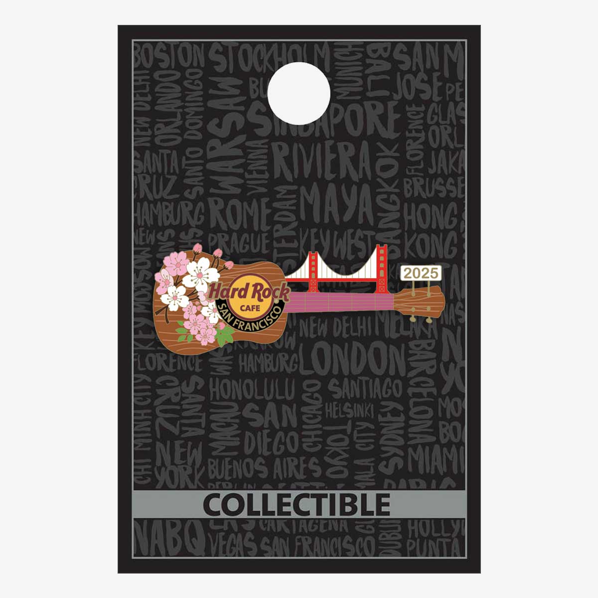 The Limited Edition Golden Cherry Blossom 2025 Pin captures the iconic spirit of San Francisco, blending cherry blossoms with the Golden Gate Bridge on a guitar-shaped design.