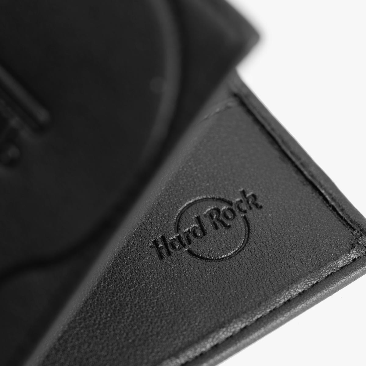 Hard Rock Watch Set with Guitar Wallet in Black Dedicated to all Hard Rock Fans. This set includes a one of a kind Hard Rock watch that is 35mm in size with a stainless steel case, white dial, contrasting dial markers and black vegan leather band. The set also includes a black vegan leather bifold wallet with an embossed electric guitar. Both come in a special giftable Hard Rock keepsake box.