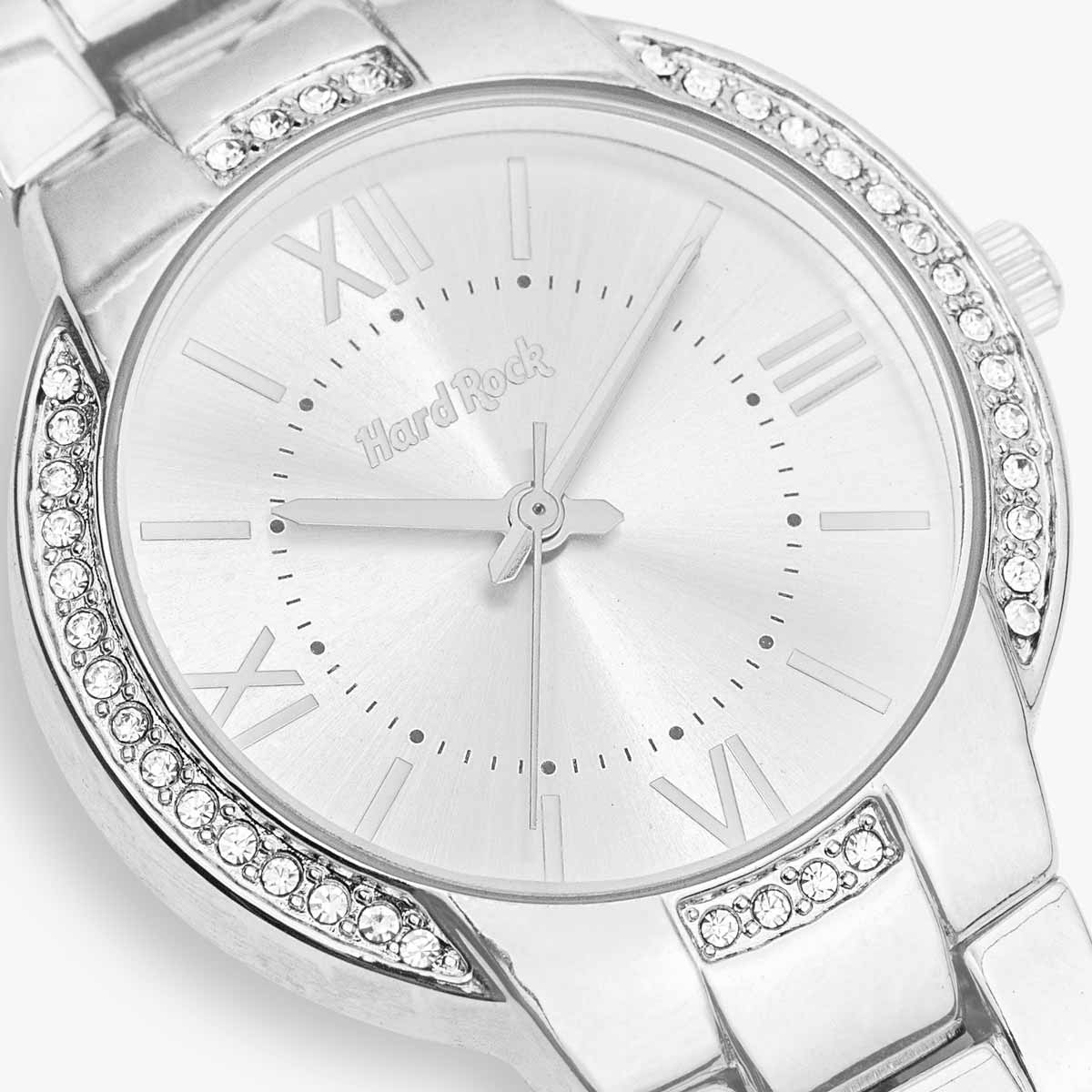 Hard Rock Watch Set with Heart Necklace and Tennis Bracelet Treat yourself or a special person to this romantically designed watch and necklace with matching bracelet 3pc gift set. Watch features a shiny silver face with crystals surrounding it. The heart pendant necklace is encrusted with clear crystals to give it a delicate diamond effect. Plus, the matching tennis bracelet is perfect to wear alone or with a bracelet stack to give your wrist some pop.