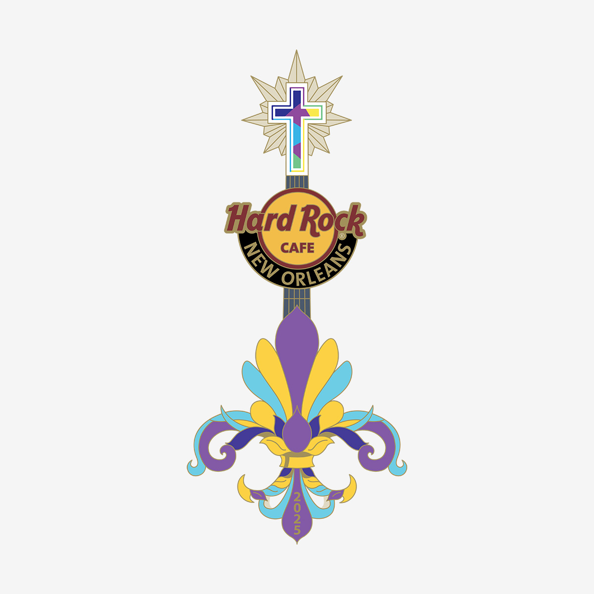 Hard Rock New Orleans Cross Fleur Guitar Limited Edition Pin brings together the thrill of gaming and the rich heritage of New Orleans in a bold, highly detailed design. A four-of-a-kind poker hand fans out behind sculpted dice, while swirling chips form a “100” that speaks to the high-stakes energy of the Crescent City. The guitar silhouette at the center grounds the design, crowned by a fleur-de-lis that highlights the city’s deep cultural roots. Finished in antique silver, this collectible pin captures the pulse of New Orleans nightlife with refined depth and dimensional detail. Whether you’re drawn to the city’s legendary music scene, its casino glamour, or its unmistakable flair, this Limited Edition pin delivers a collectible piece with real presence. Perfect for fans of themed enamel pins, destination collectibles, and music-inspired memorabilia that celebrate local icons and unmistakable style.